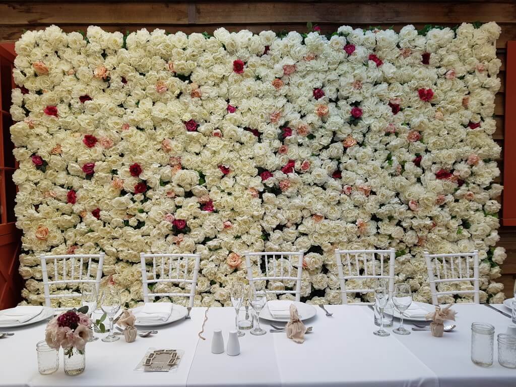 6 metre wide flower wall available in white and cream base with the option to add coloured flowers of your choice.